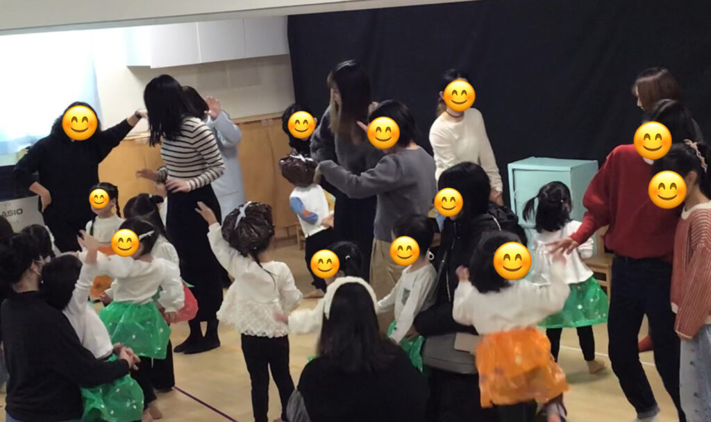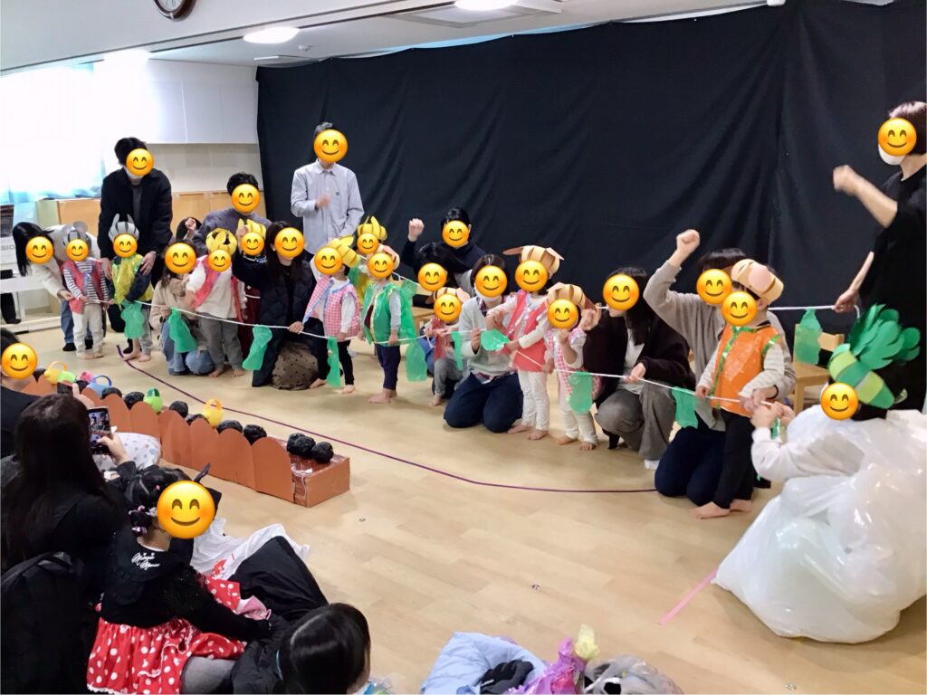 くいしんぼうのオバケの子ばけたくんが冷蔵庫の中にある食べ物を食べて色んなものに変身しましたよ♪最後は「おばけのバケちゃま」を保護者の方と一緒に踊って楽しみました。