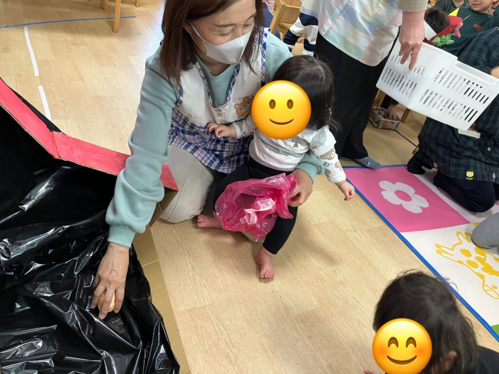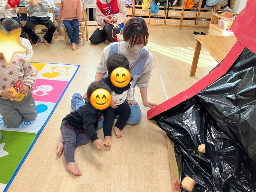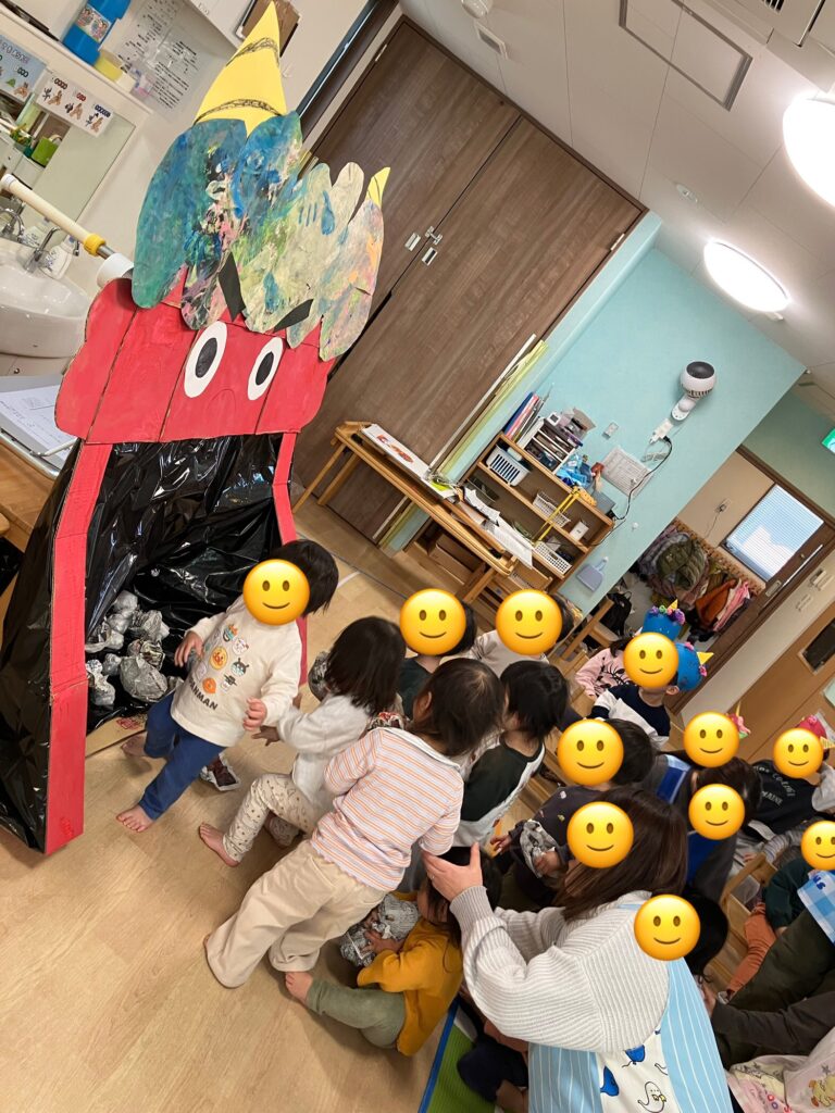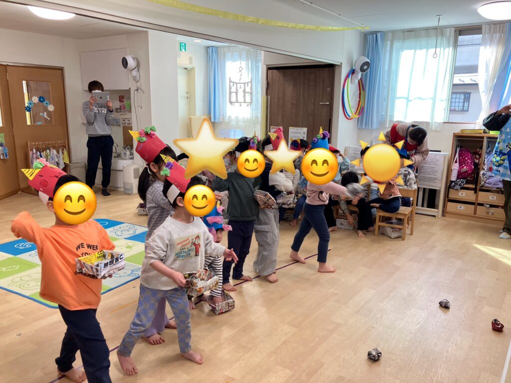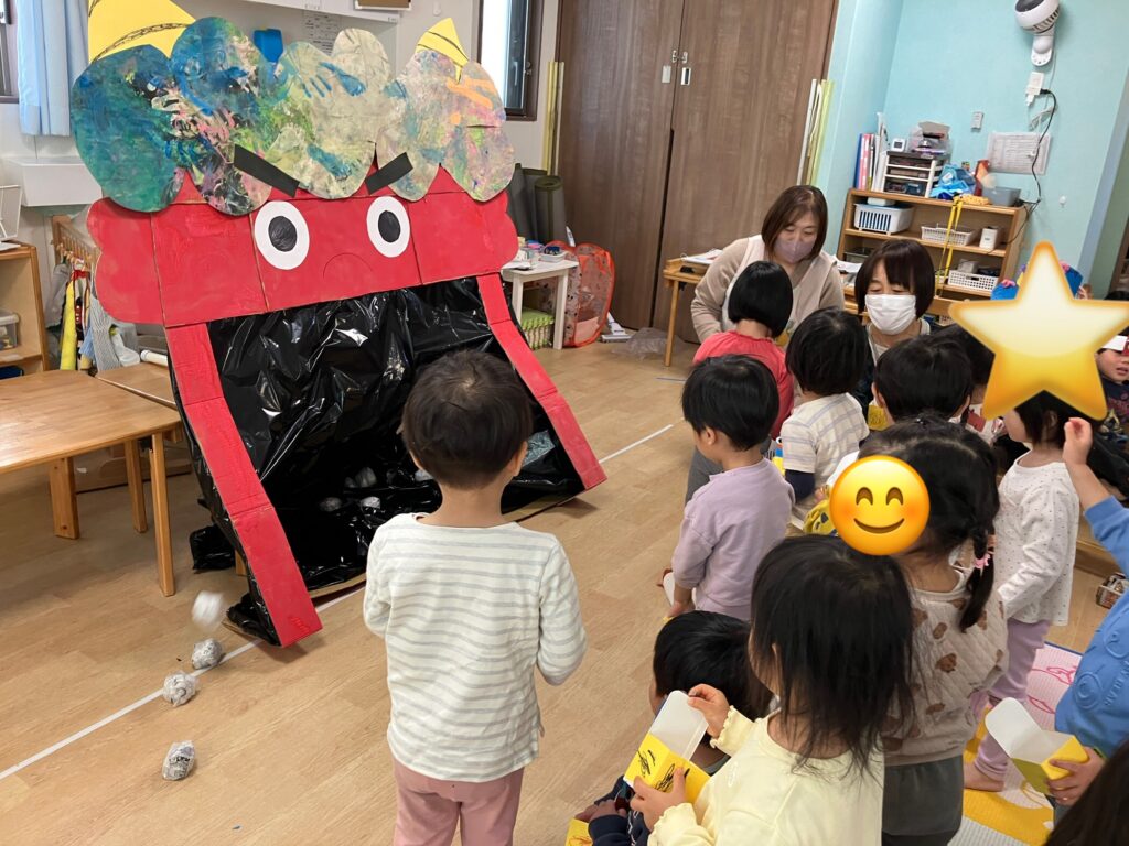2月3日は節分。学びの保育園のお友だちみんなで豆まきをしました。